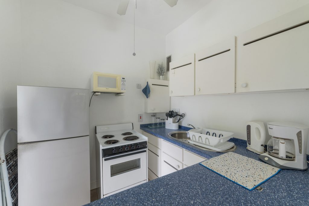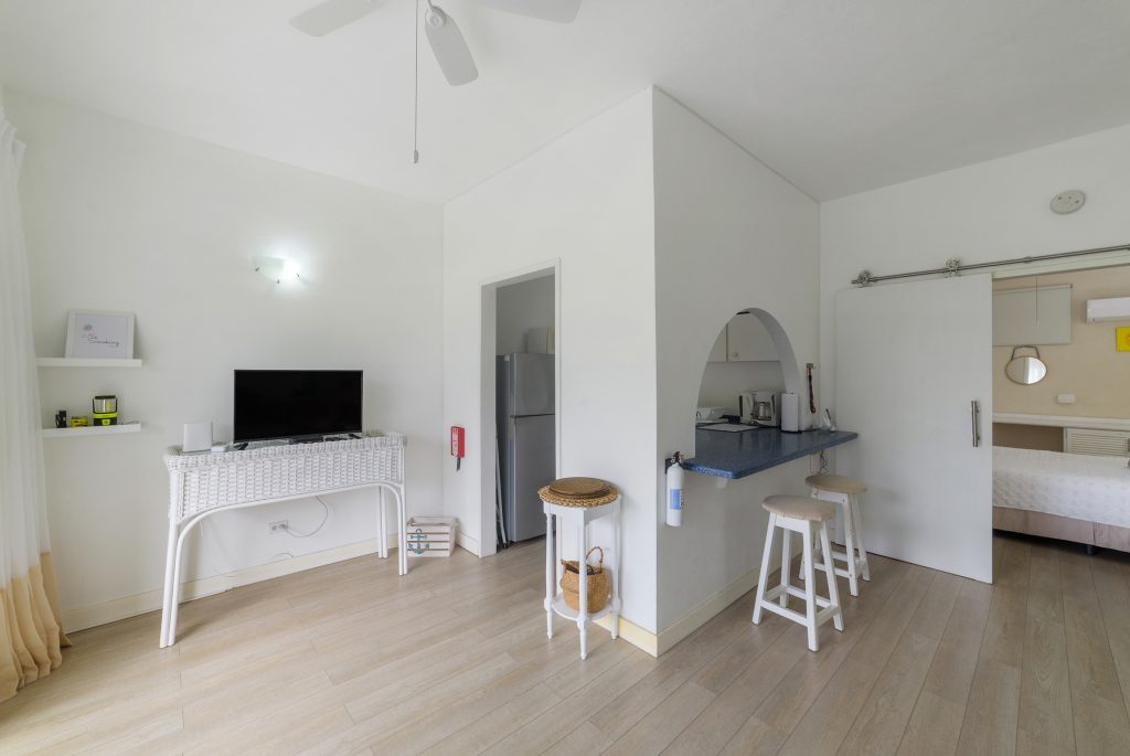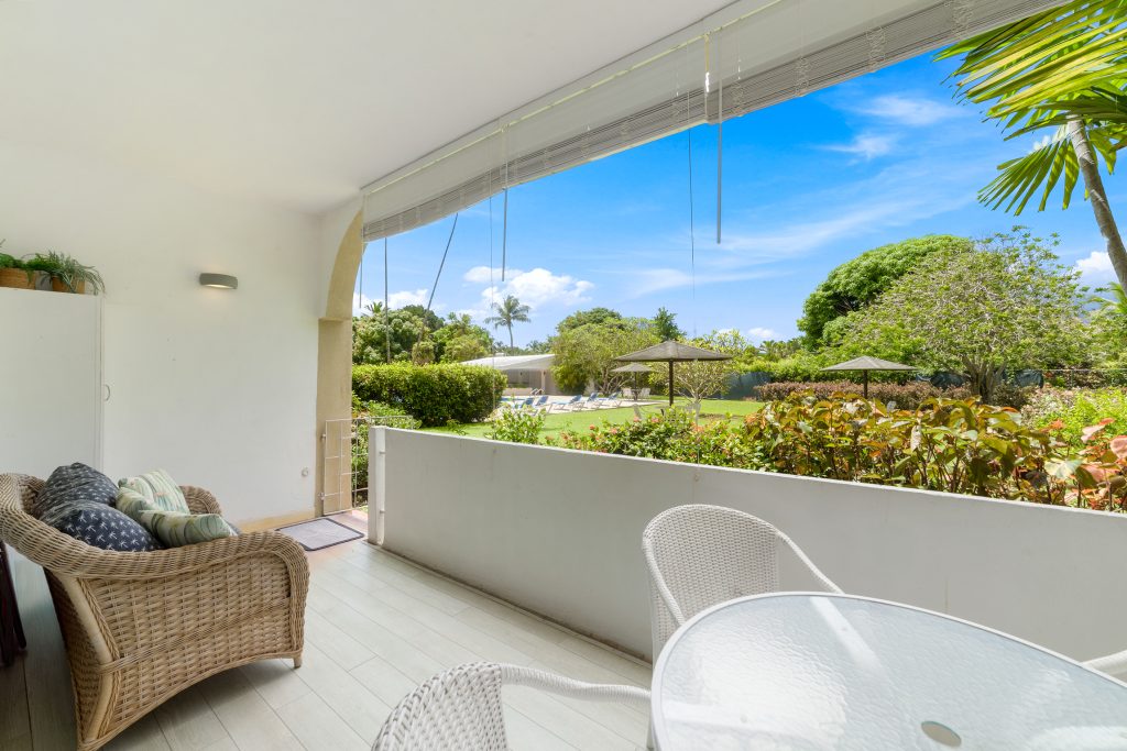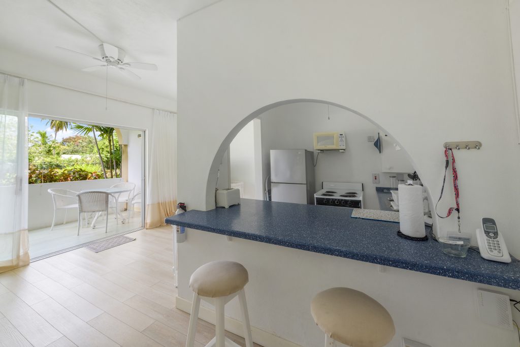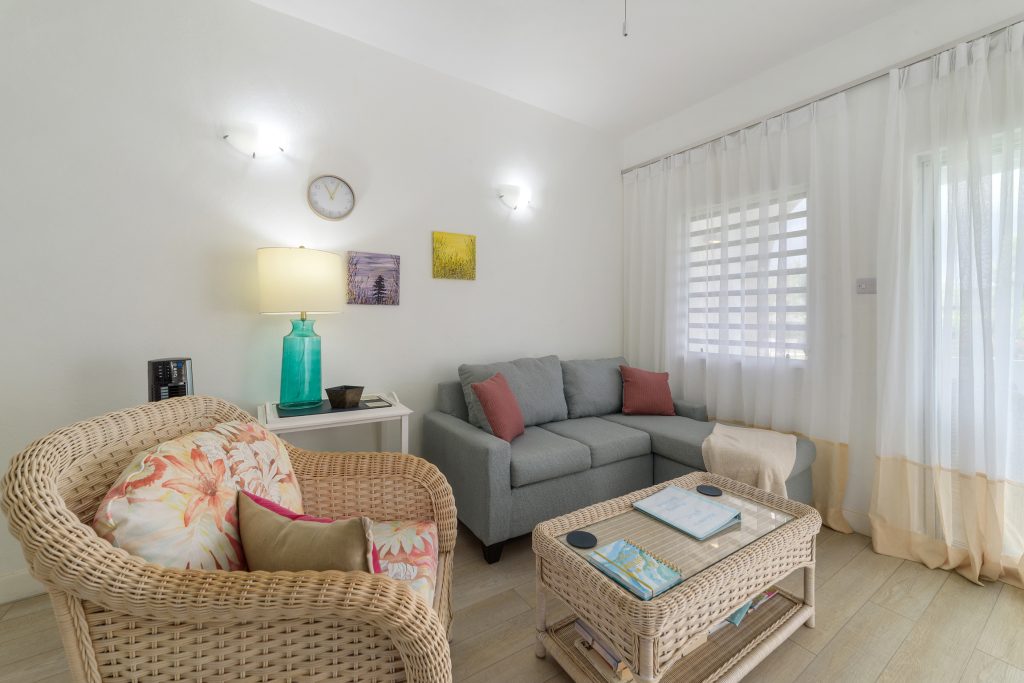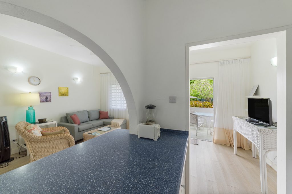 As you enter the condo, youโll be greeted by a open-plan living area that seamlessly flows into the dining area and fully equipped kitchen. The living area is elegantly furnished with comfortable seating, a flat-screen TV, and large sliding glass doors that open onto a covered patio whilst viewing a luscious, green garden where you can enjoy a cup of tea or rum punch.