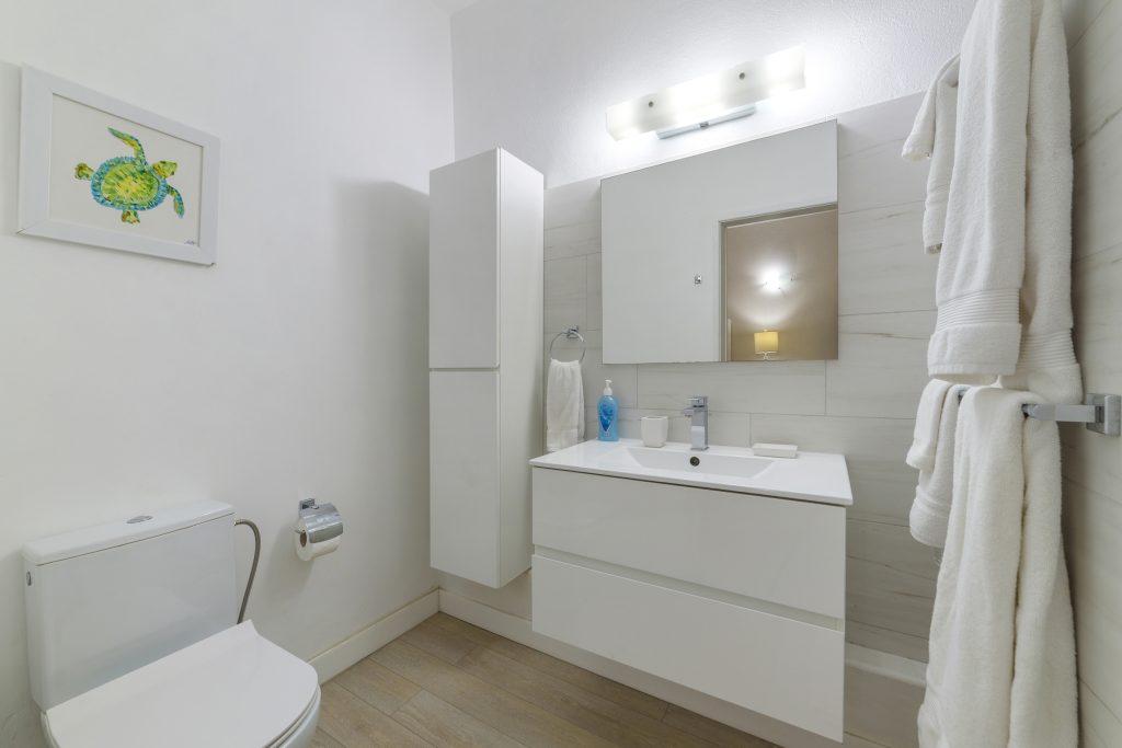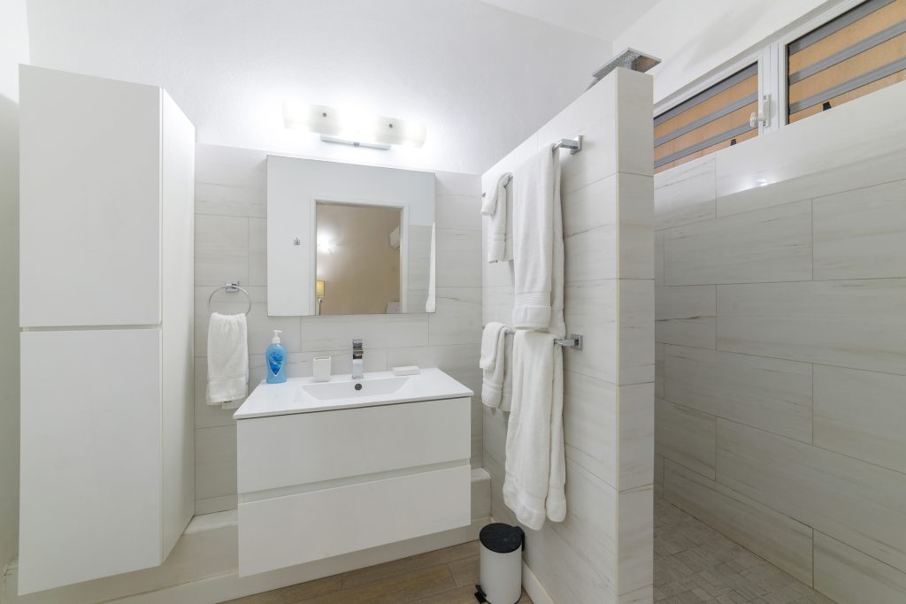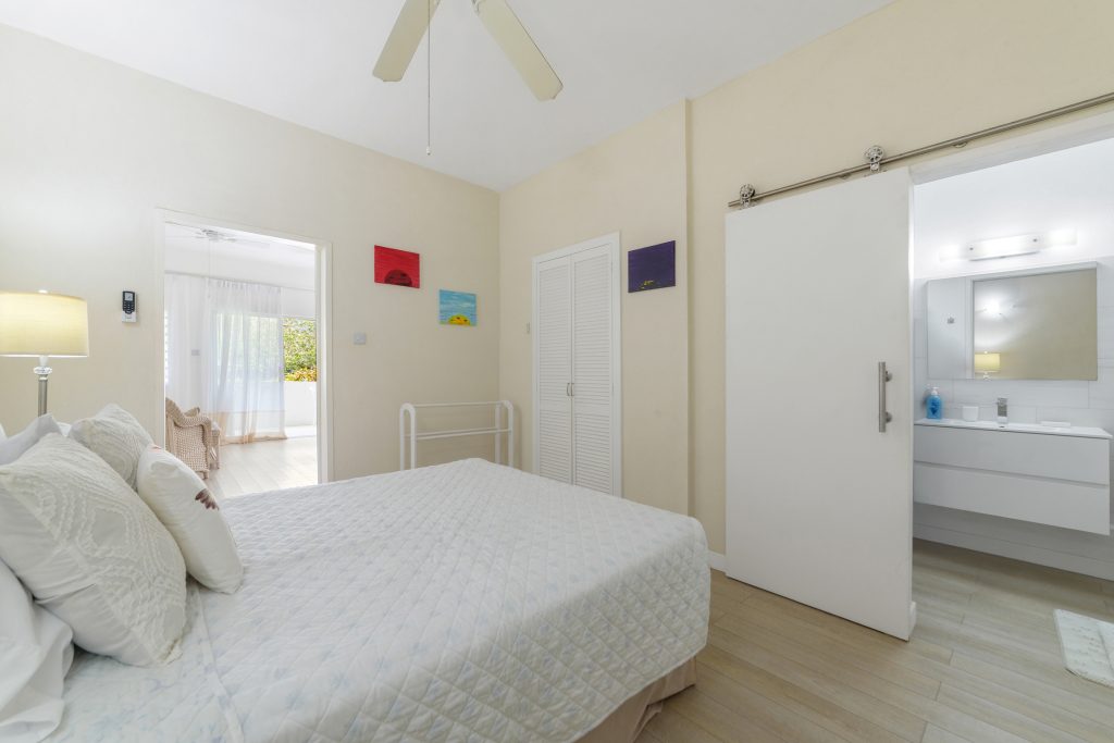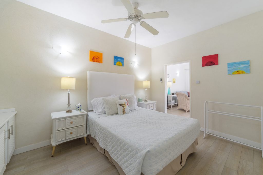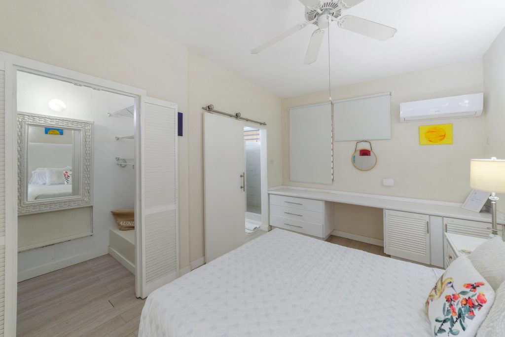The bedroom is a tranquil haven featuring a plush king-size bed and storage space. There is an en-suite bathroom for a nice shower after a lovely day exploring beautiful Barbados.