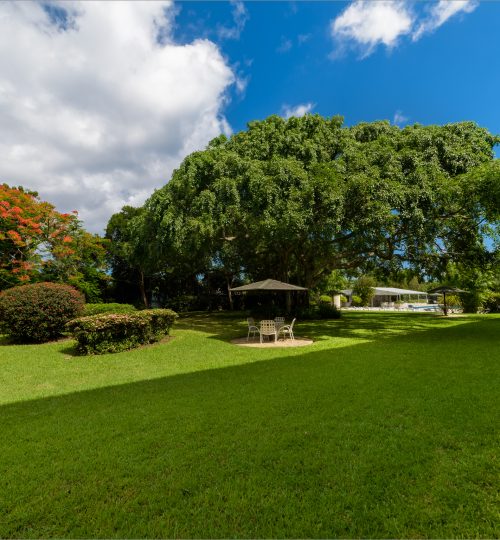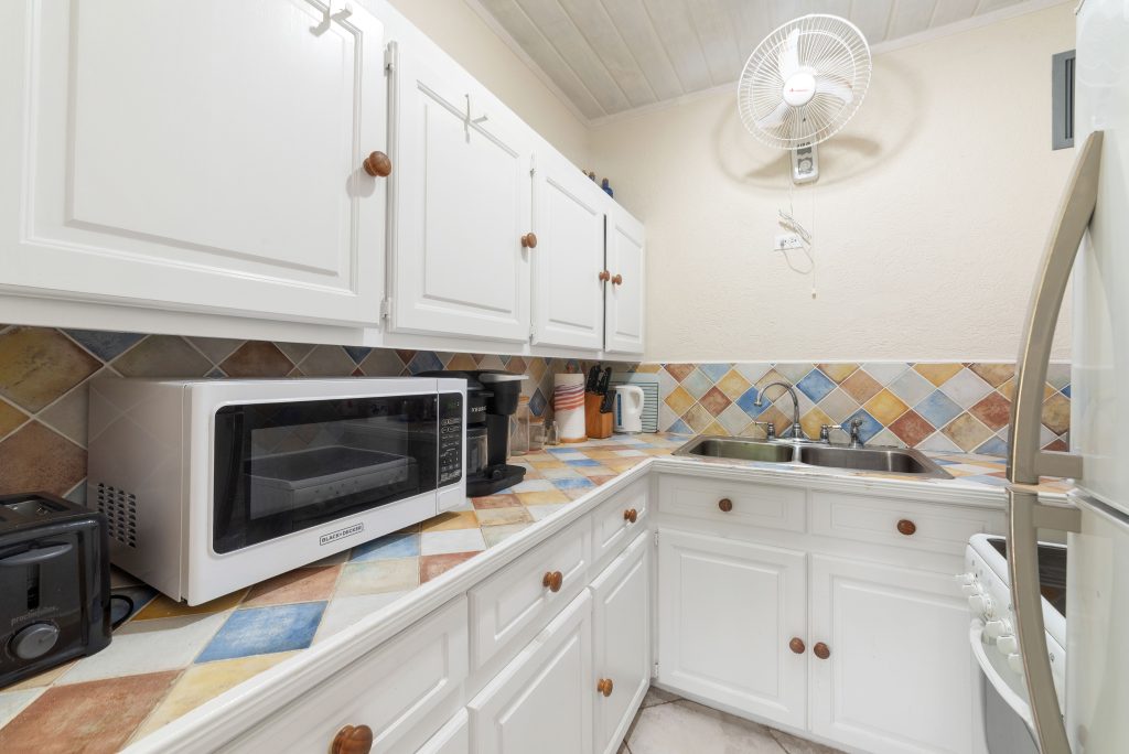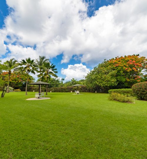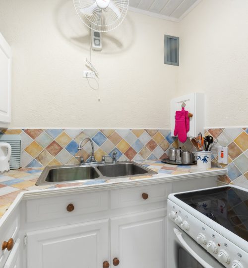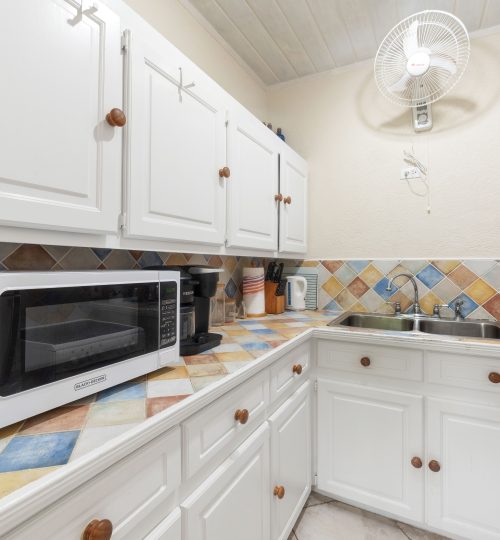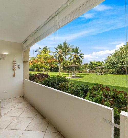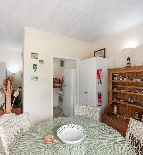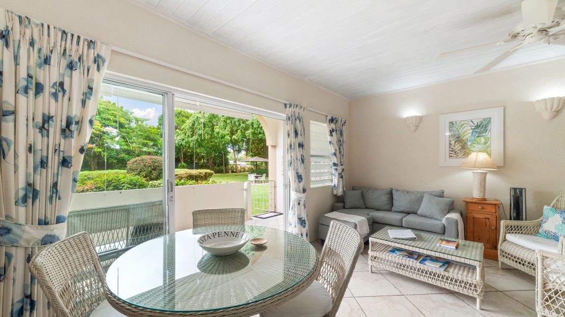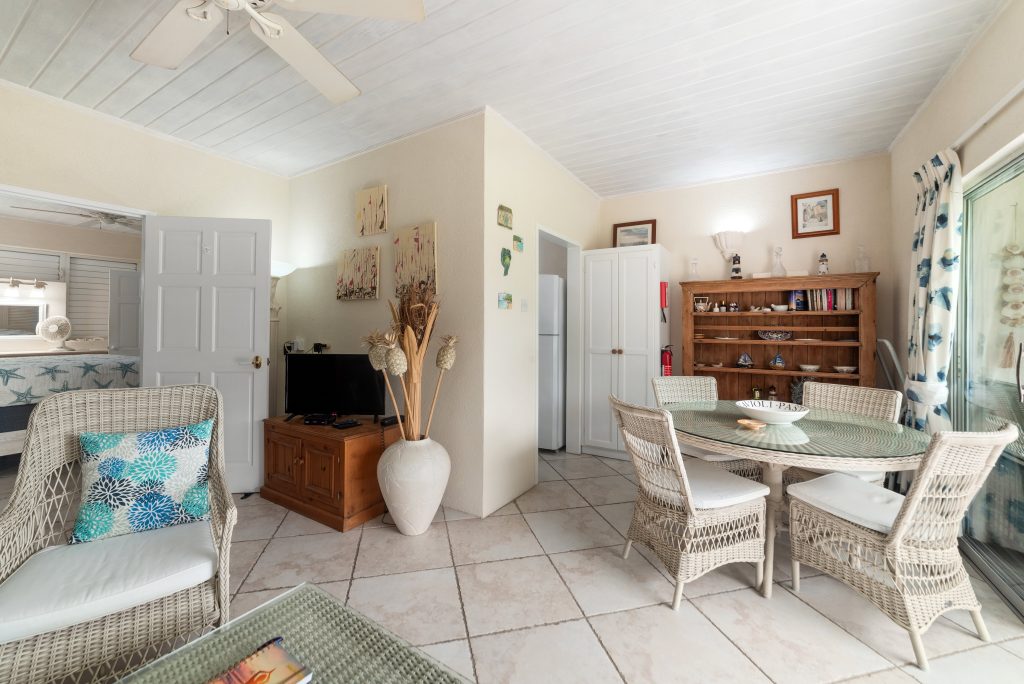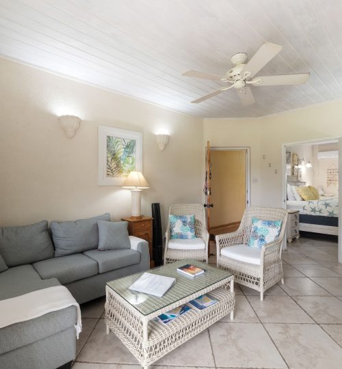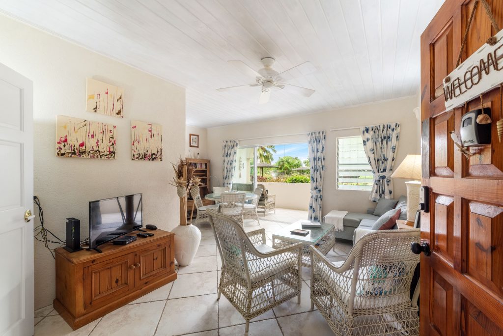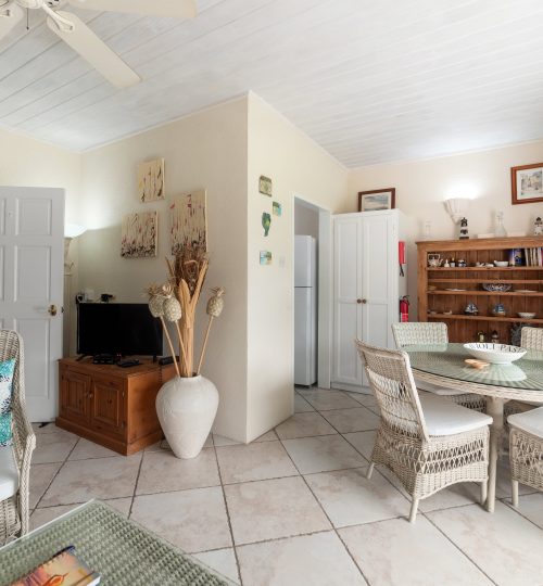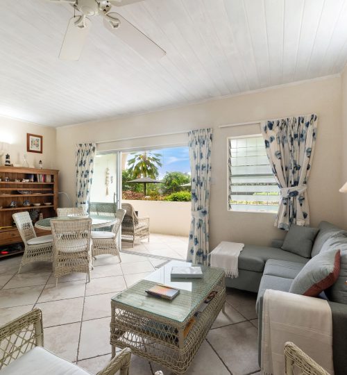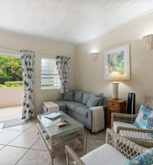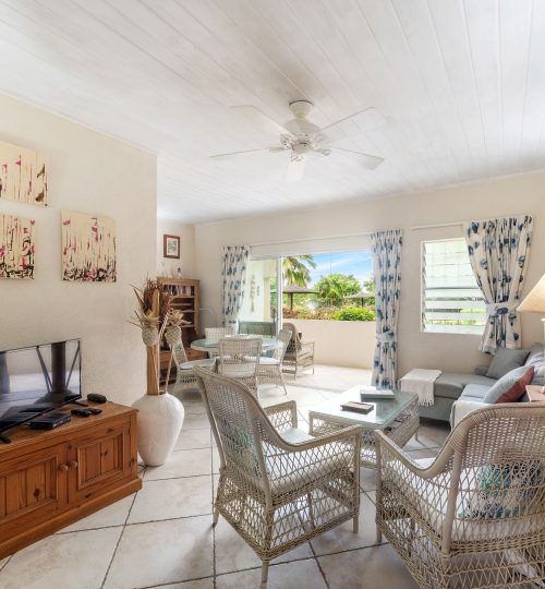 As you enter the condo, youโll be greeted by a open-plan living area that seamlessly flows into the dining area and fully equipped kitchen. The living area is elegantly furnished with comfortable seating, a flat-screen TV, and large sliding glass doors that open onto a covered patio whilst viewing a luscious, green garden where you can enjoy a cup of tea or rum punch.