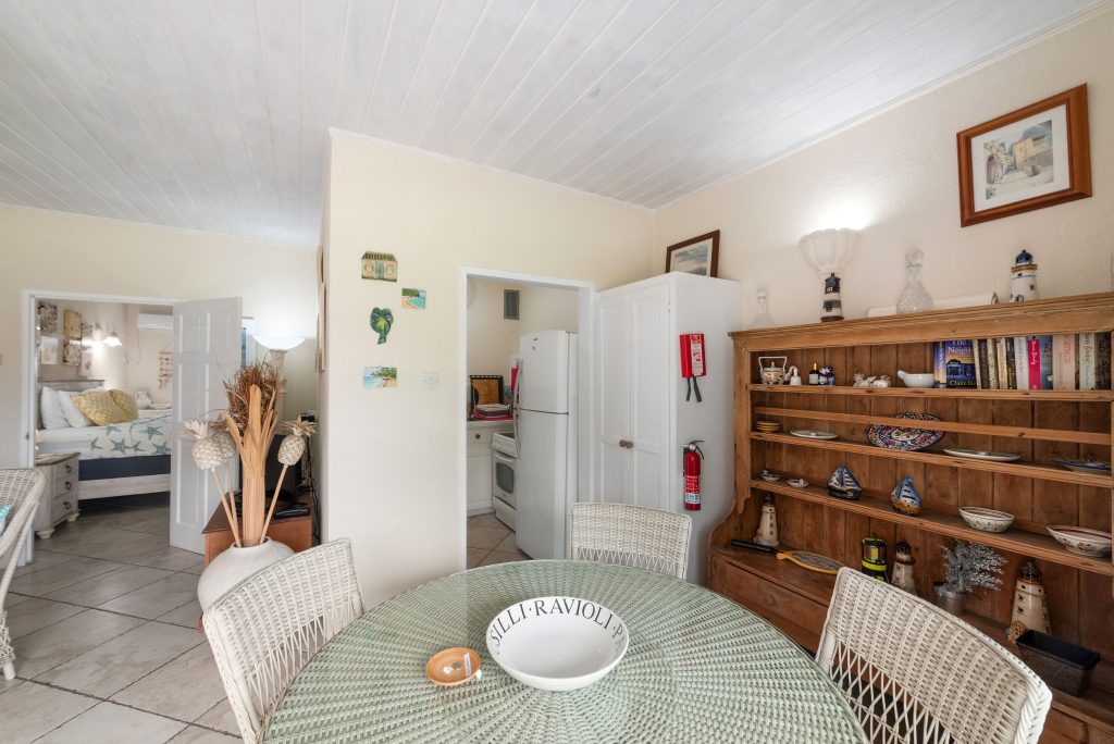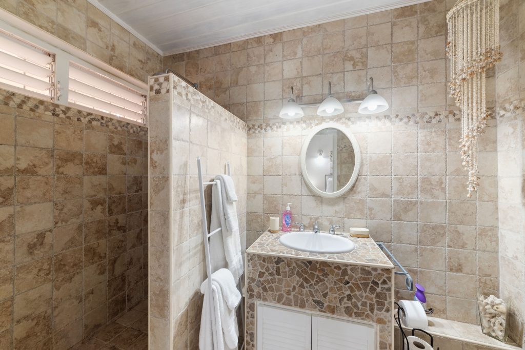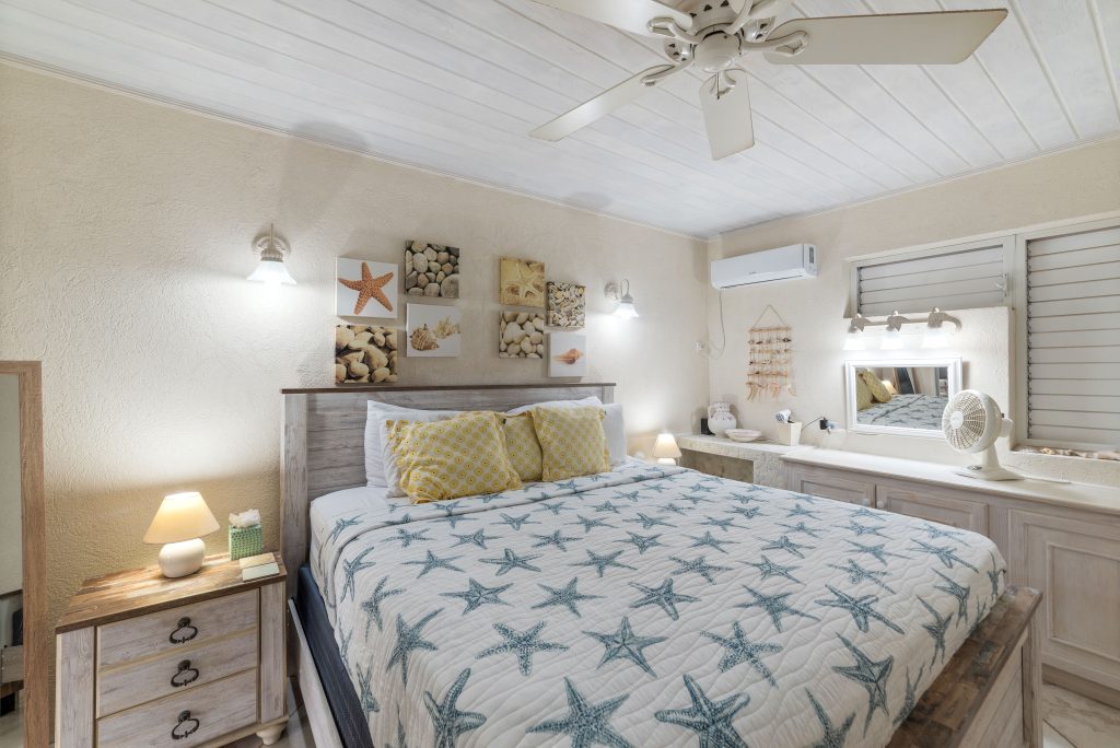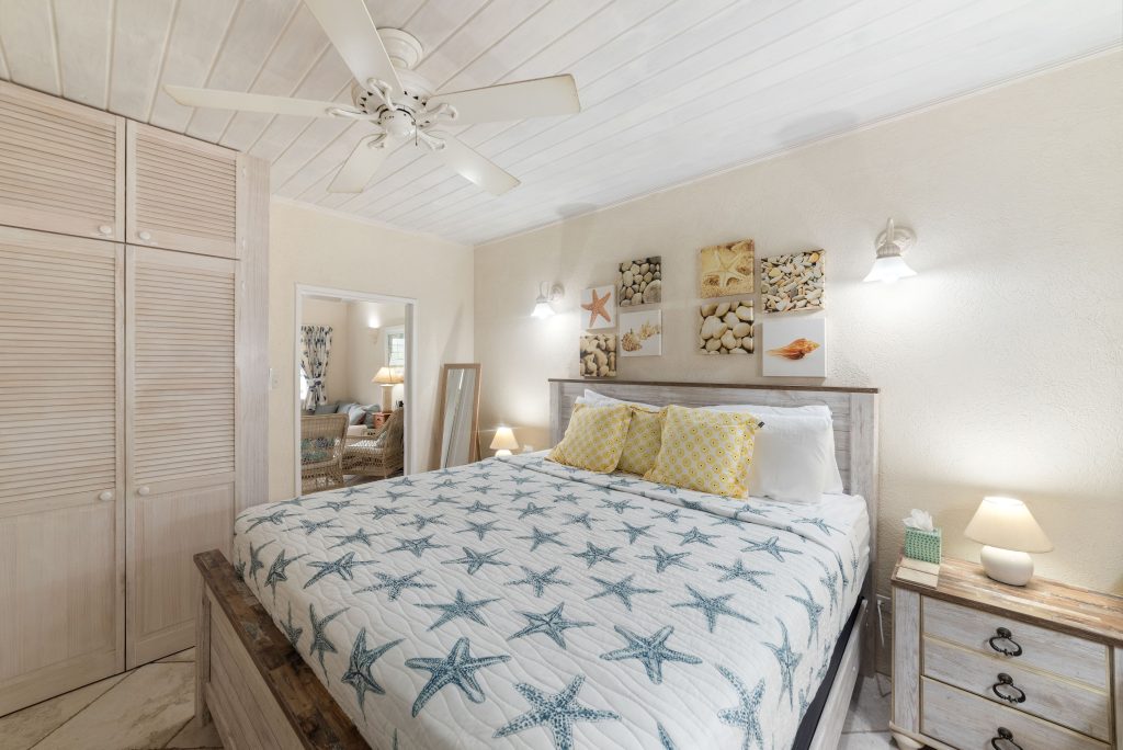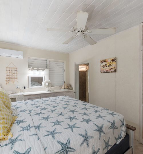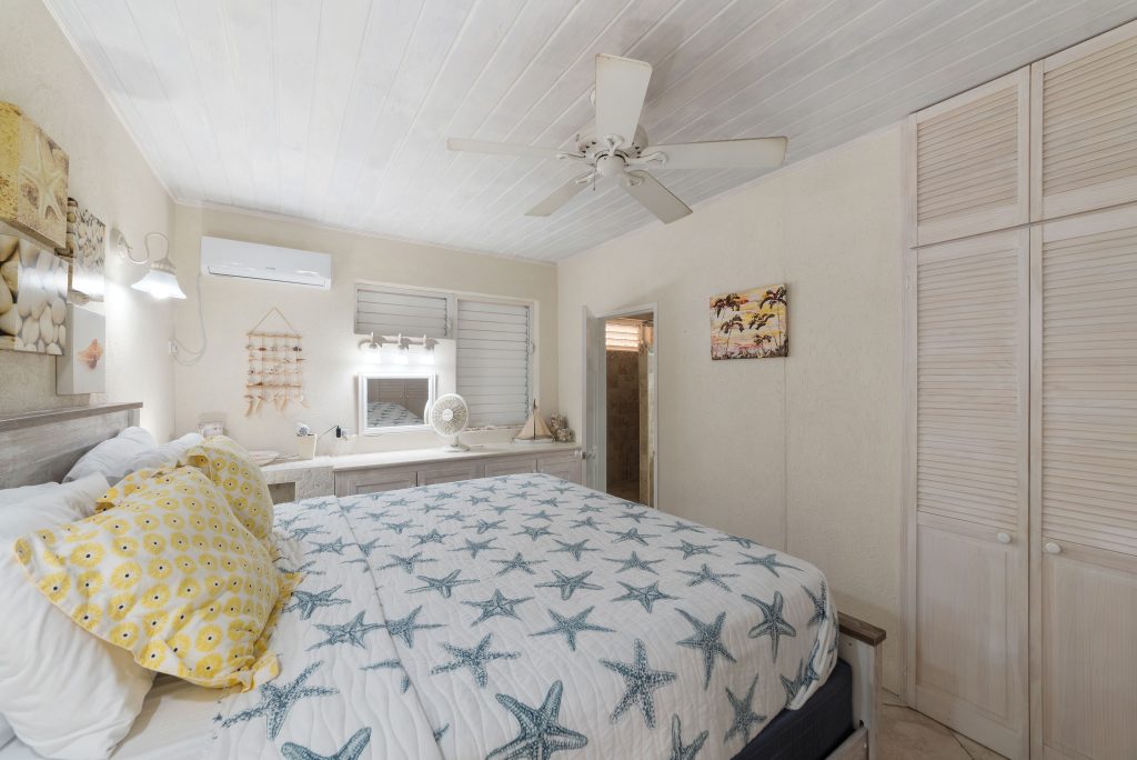 The bedroom is a tranquil haven featuring a plush bed and plenty storage space. There is an en-suite bathroom for a nice shower after a lovely day exploring beautiful Barbados.