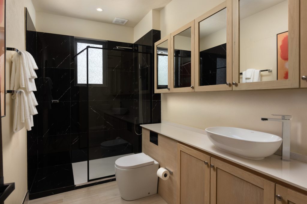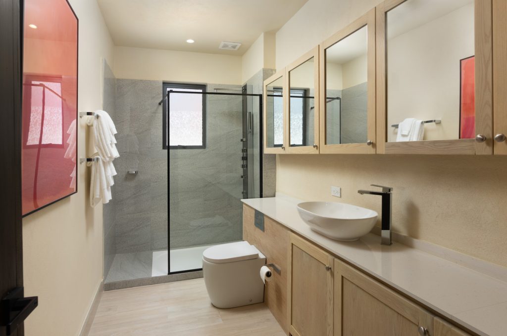 On the ground floor, youโll find three additional bedrooms, two bathrooms, a second fully equipped kitchen, and easy access to the garden level.
