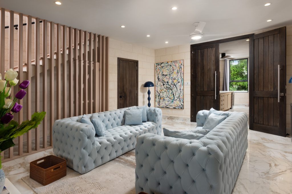 The upper floor features four bedrooms and three bathrooms (two en-suite), high ceilings, a day room, living room, and a custom kitchen with coral stone accents, white mahogany cabinetry, and a large island with porcelain countertops. A cozy reading nook and several living areas enjoy views of the Caribbean Sea, including the primary suite which opens out to a private balcony.