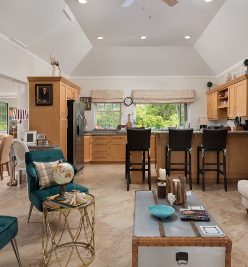 lows into an expansive open-plan living space. The kitchen, finished with granite countertops, seamlessly connects to the living and dining areas, flowing onto the spacious patio boasting breathtaking views of the Caribbean Sea.