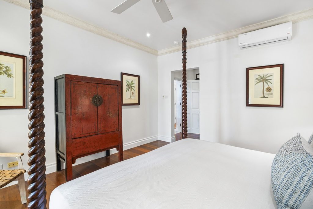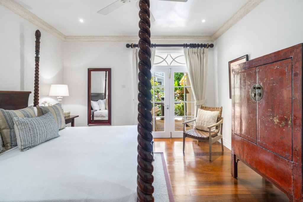Primary Suite: Features a king-sized four-poster bed, polished wooden floors, and an ensuite bathroom with marble finishes and a walk-out to the terrace.