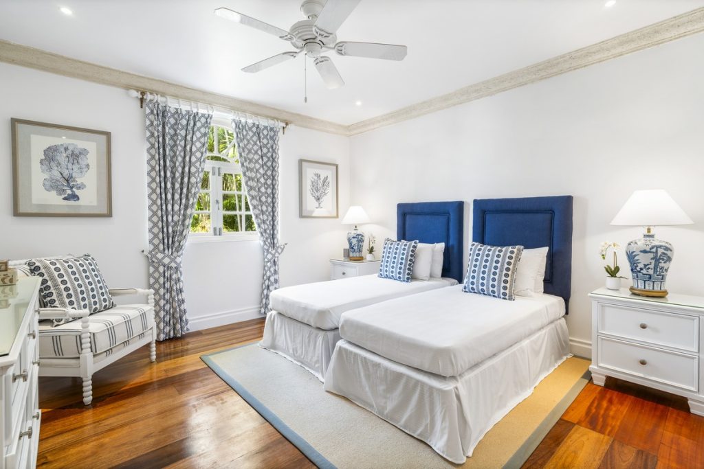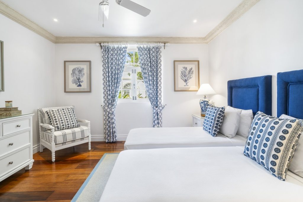 Guest Bedroom 3: Fresh and inviting with twin beds, dressed in crisp white and blue dรฉcor, and an ensuite bath with walk-in shower.
