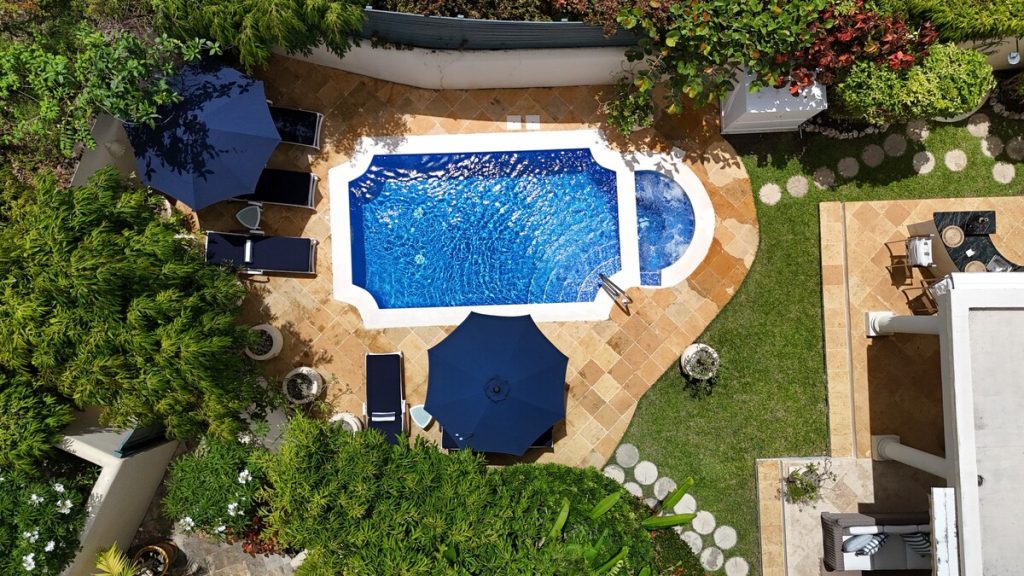 Designed for relaxed Caribbean living, the outdoor space is the heart of the villa. The covered terrace features a lounge area, al fresco dining, and a sleek bar overlooking the pool โ perfect for long lunches and sunset cocktails. The pool is framed by potted palms and sun loungers shaded by navy umbrellas, offering complete privacy and tranquility.