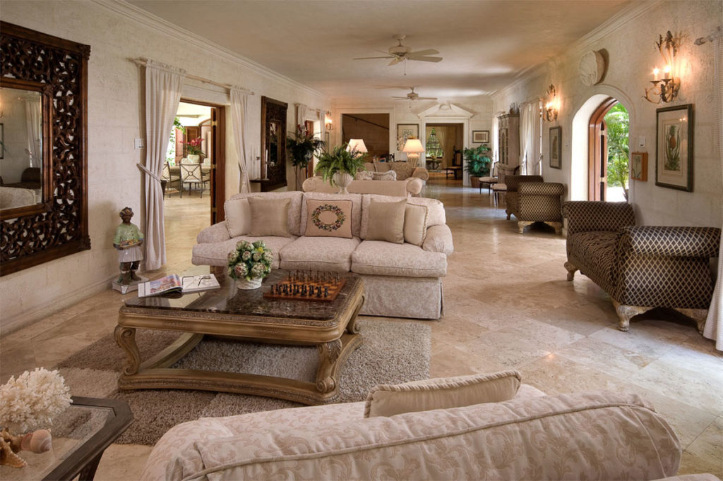 Inside this coral-stone villa are marble floors and high-end furnishings. The formal living room is done in pleasing, neutral tones with elegant furniture and home decor. You wonโt need to worry about cookingโyour stay includes the services of a chef. Enjoy dinners either in the interior dining room, or head to the gazebo for an alfresco meal under a unique chandelier. Other on-site staff includes a butler, two maids and a night guard.