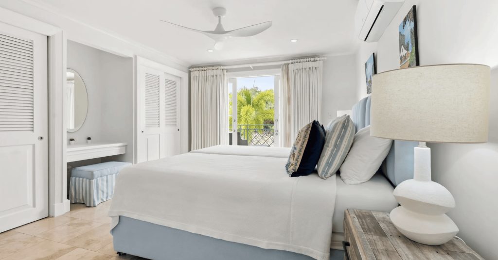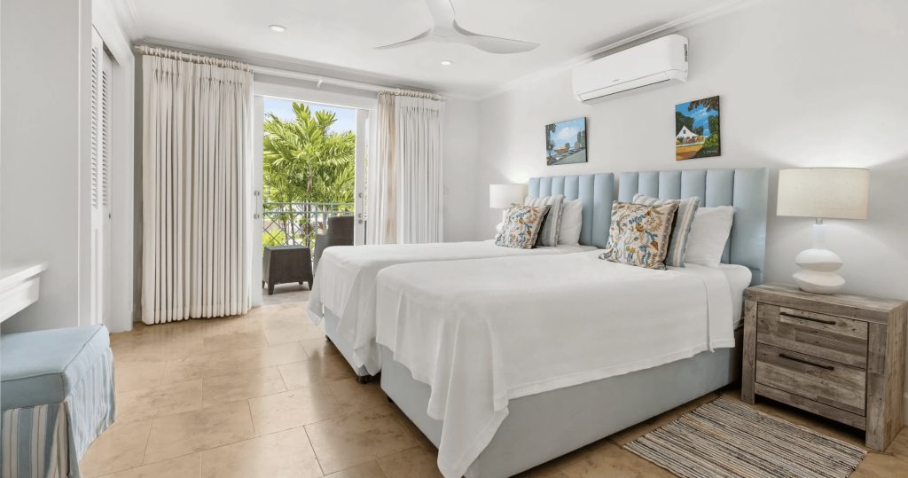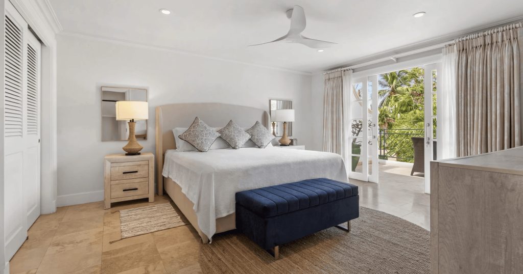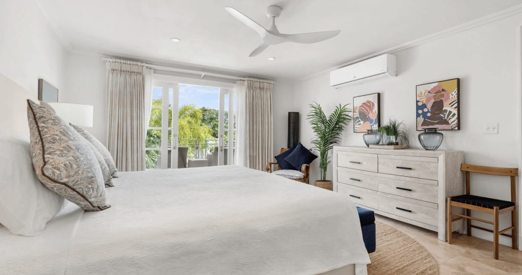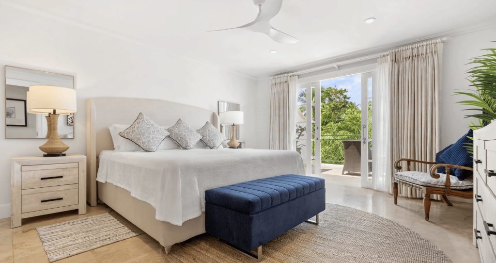 The Master en-suite Guest bedroom is situated on the second floor, with balcony views over the Mullins Beach area and Caribbean Sea.