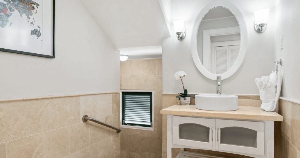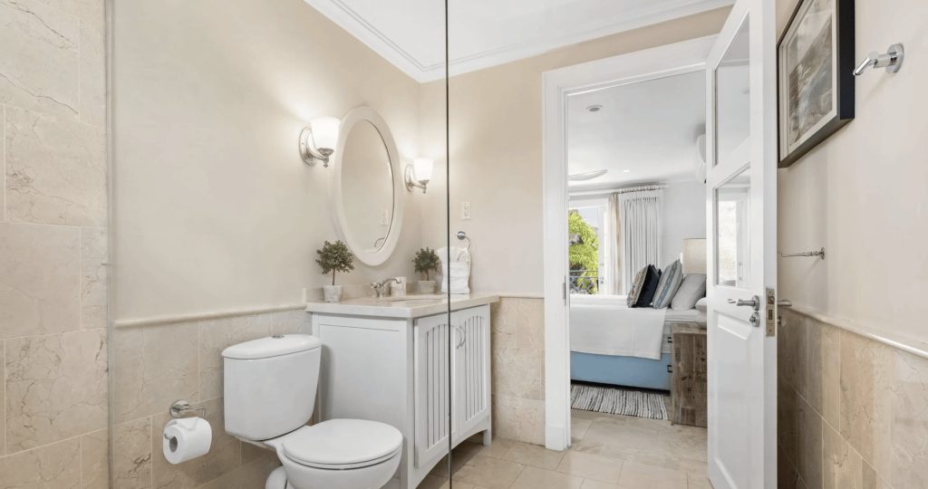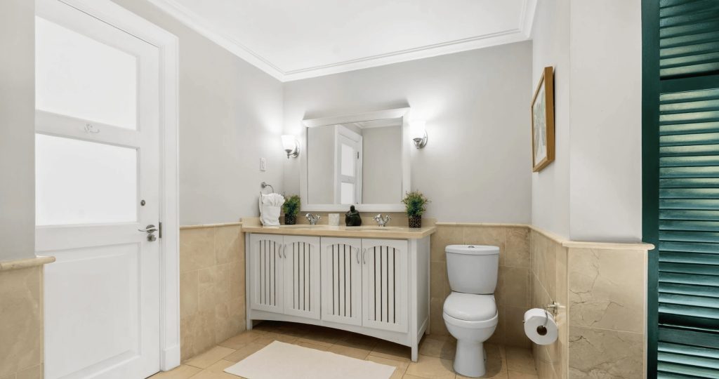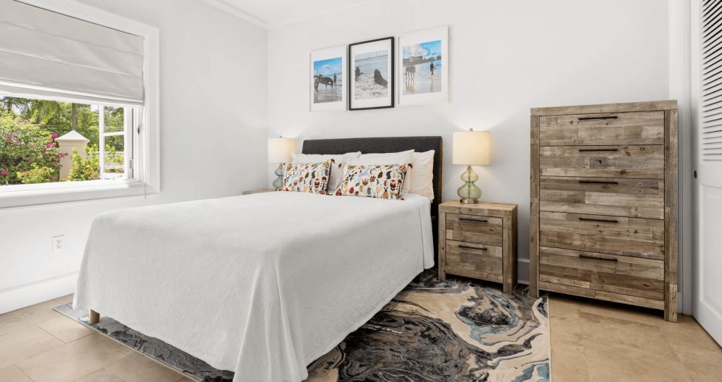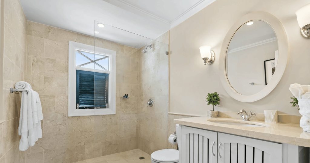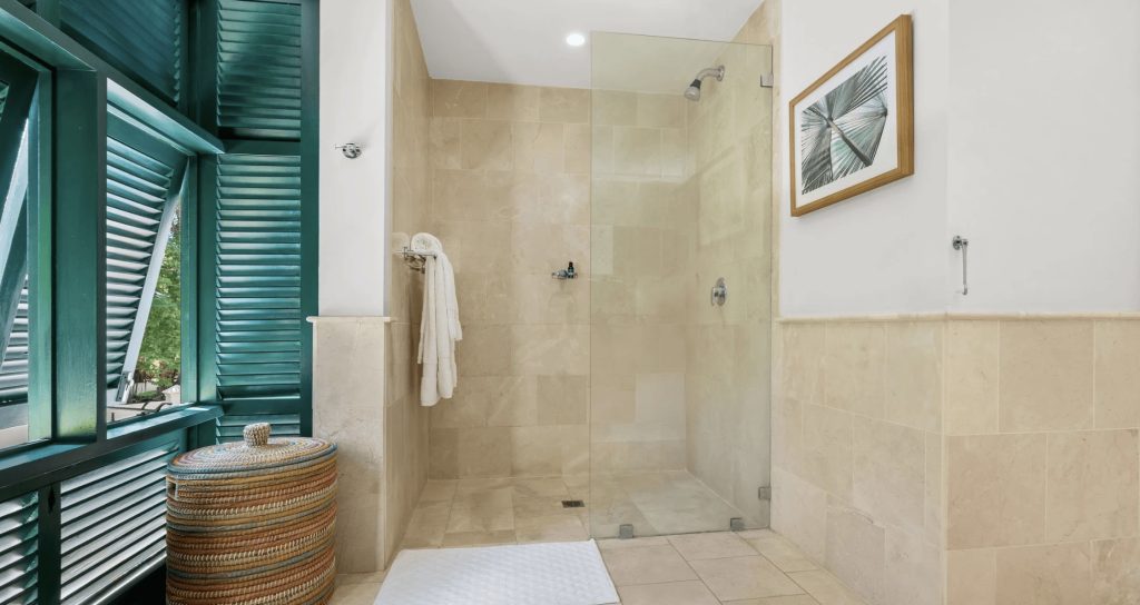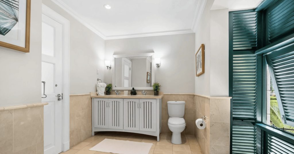 The first floor comprises of two additional en-suite Guest bedrooms. Bedroom one is furnished with a King-size bed and Bedroom two with twin beds. Both bedrooms enjoy access to a shared terrace which overlooks the pool deck and offers views of the Mullins Bay Complex.