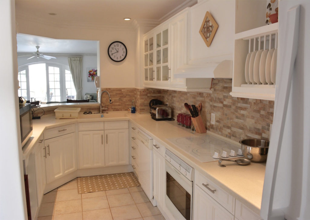 The well-appointed and highly decorated kitchen is designed for easy living and casual meals, with an open counter area.