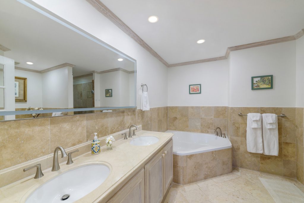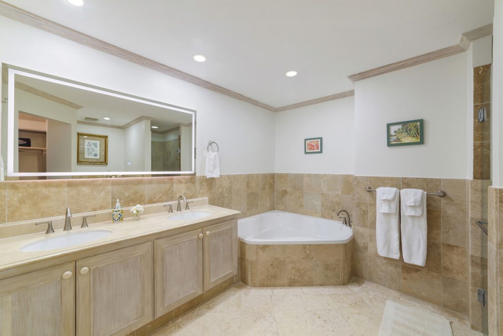 The living room opens onto a generous 200 sq. ft. patio where you can sip morning coffee in the sunshine, enjoy evening cocktails in the shade, and admire the lush, meticulously maintained tropical gardens.
