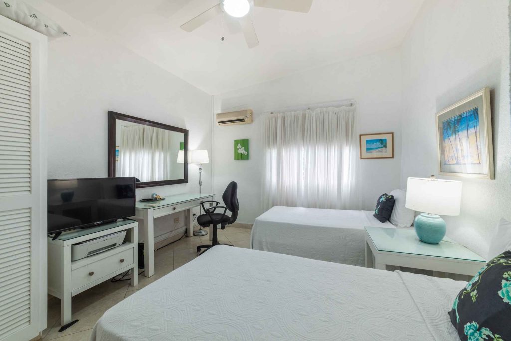 Nestled amidst stunning gardens, the house features a master bedroom with a king bed, a second bedroom with a queen bed, and a third bedroom with two twin beds, each comfortably air-conditioned.