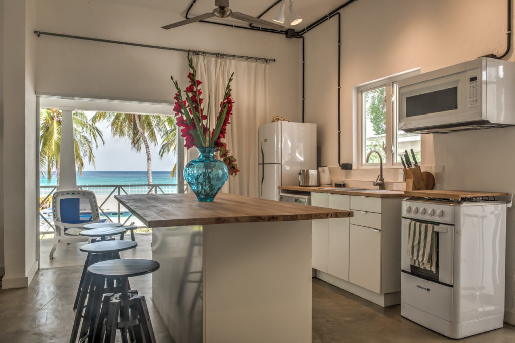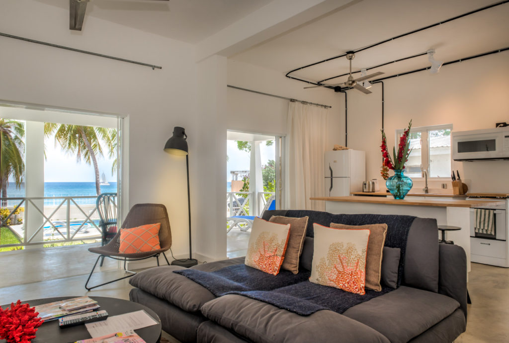 “Sunset” is one of six one- and two-bedroom apartments which are newly refurbished and modernized at The Moorings in Fitts Village. They are right next to a beautiful beach, across the road from shops and amenities, on a convenient bus route, and have their own garden, barbecue area, and plunge pool. But basically what you’ll fall in love with are the views. Breathtaking.